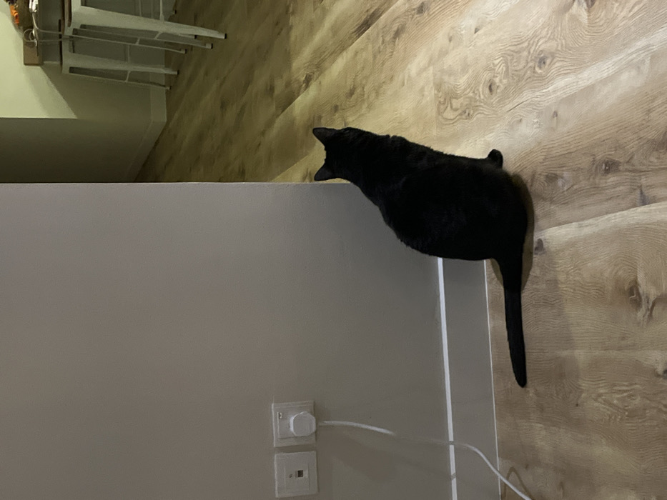The image depicts an indoor scene within a residential or commercial building in Ras Al-Khaimah, United Arab Emirates. A black domestic cat is the central subject, seated on a light brown wooden laminate floor with its back to the viewer. The cat is positioned facing towards the right side of the frame, observing an area beyond the visible wall partition. To the left, a light beige wall features two white electrical outlets. One outlet has a white power plug inserted, with a thin white cable extending downwards towards the floor. The lower portion of the wall includes a white baseboard. In the background, to the right of the wall partition, a dimly lit interior space with matching wooden flooring is visible, containing the lower portions of two white-framed bar stools and a table or counter. No people are present. The lighting suggests an indoor setting with artificial illumination.