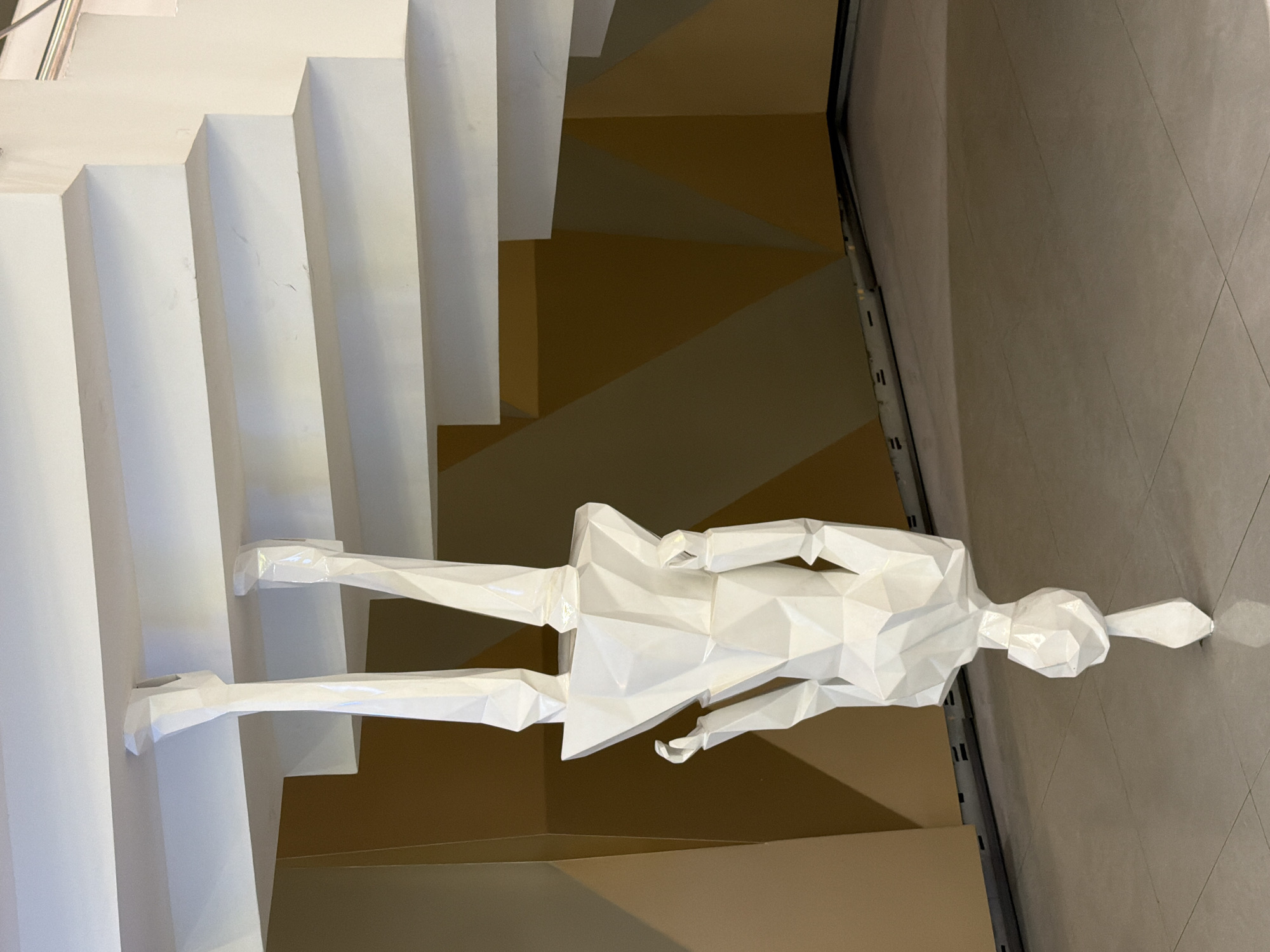 An inverted, white, geometric polygonal sculpture of a human figure is centrally positioned indoors in Kuala Lumpur, Malaysia. The sculpture's feet are securely affixed to the smooth underside of a white, multi-stepped staircase ascending towards the right. The figure's head, featuring a faceted tie, hangs approximately one foot above a light grey tiled floor. Its arms are bent at the elbows, with hands positioned near the waist. The background features a wall composed of large, intersecting brown and tan geometric panels. The floor is covered with large, light grey square tiles.
