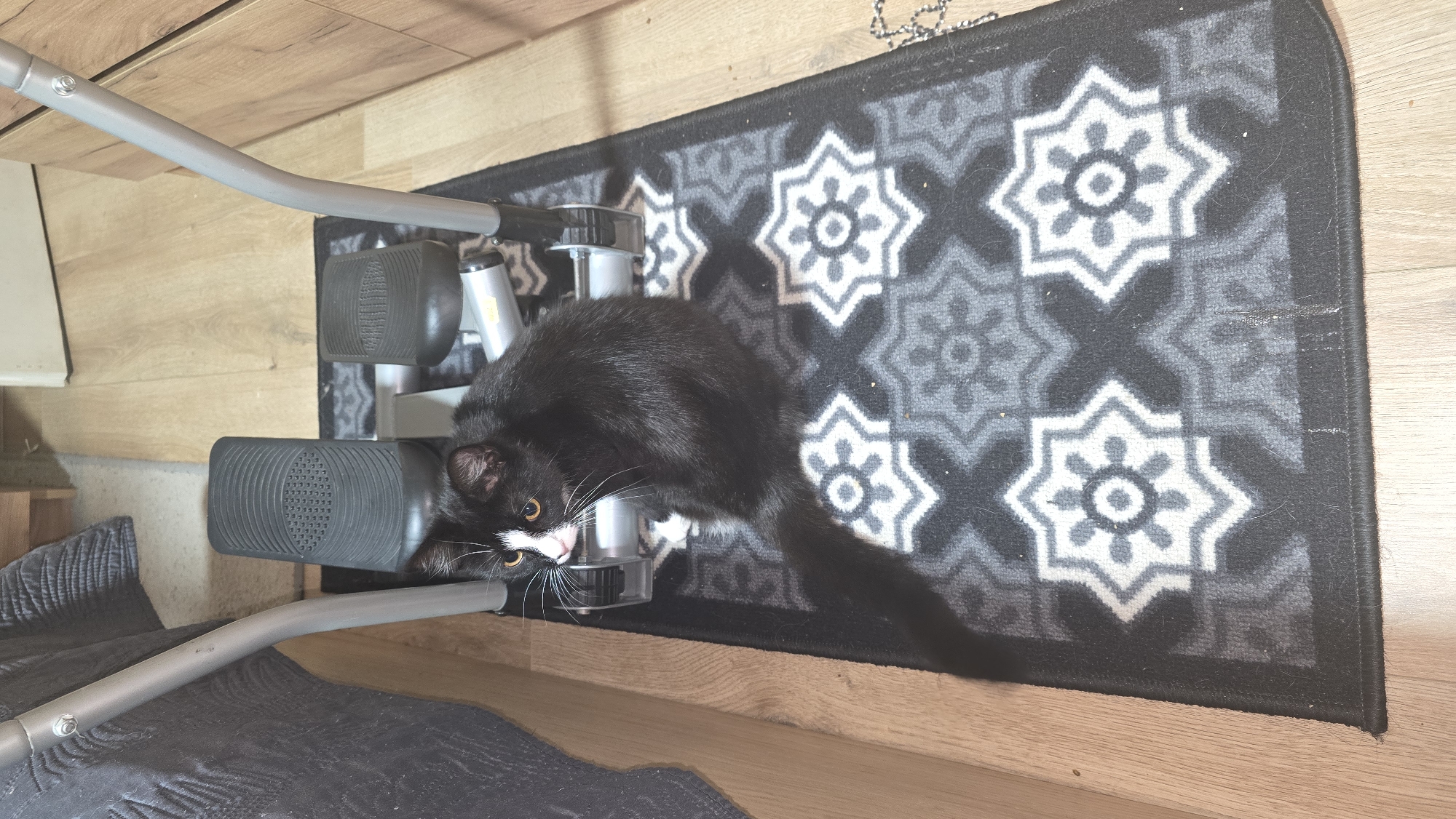 The scene depicts an indoor residential area in Helmond, Netherlands. A black and white domestic cat, exhibiting a tuxedo pattern with a white muzzle, chin, and chest markings, and possessing amber-colored eyes, is positioned centrally on a dark grey patterned area rug. The cat is seated, looking towards the viewer's left. Immediately behind and slightly above the cat is a silver-toned mini-stepper exercise machine, equipped with two black, textured foot pedals. The rug features a repetitive pattern of light grey eight-pointed star-like motifs on a dark grey field. This rug rests on a light-colored wooden plank floor. To the left of the frame, a dark grey quilted bedspread or cover is visible, suggesting a bed. To the right, a light brown wooden chest of drawers or cabinet is partially visible. A cream-colored wall or doorframe is present in the upper right background.