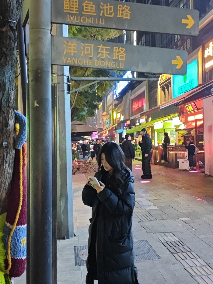 A young woman in a black puffer coat looks at her phone on a city street. Above her are signs in Chinese and English pointing in opposite directions: "IYUCHIIU" and "YANGHE DONGLU." People are milling about in the background. The street is lined with shops and restaurants, lit with colorful neon signs. A knitted item hangs from a pole on the left.