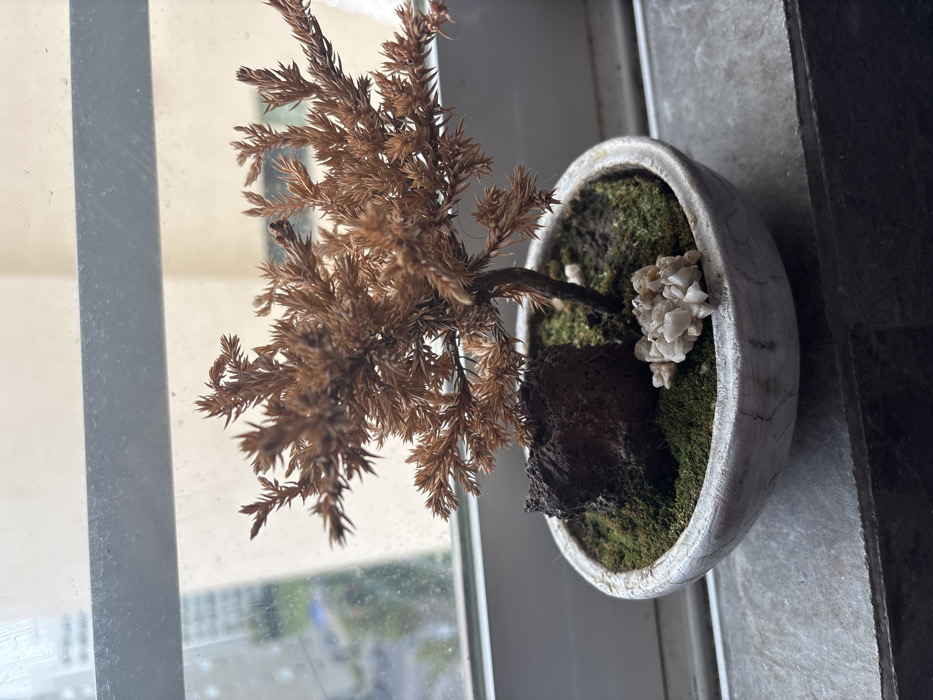 - "This image depicts a static scene of a dried-out bonsai plant positioned on a dark gray tiled windowsill inside a building in Interlomas, Mexico" by FM-mLRHH2, licensed under CC BY 4.0