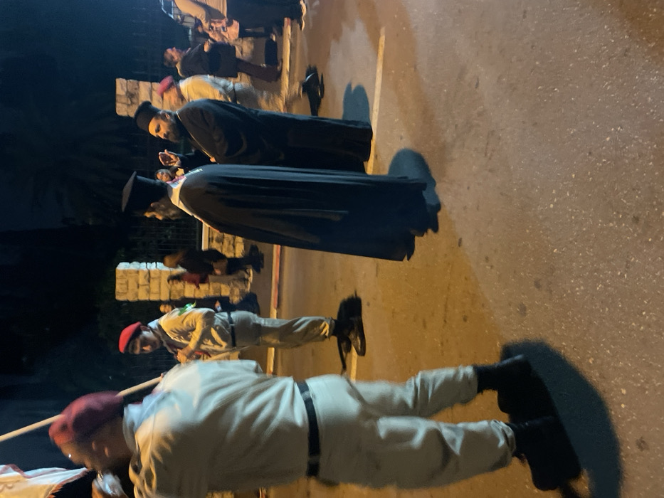 The image depicts a nighttime street scene in Haifa, Israel, during what appears to be a public gathering or procession. In the mid-ground, two male individuals, identifiable as Christian clergy by their black robes (exorassons) and distinct black cylindrical hats (kalimavkion), are standing on an asphalt street. The cleric on the left is seen mostly from behind, while the cleric on the right, with a dark beard, faces left and appears to be interacting or conversing, with his right hand slightly raised. To the left of the clergy, two individuals are visible in what appear to be uniforms. The person in the immediate foreground, largely obscured and blurred from the chest up, wears light-colored trousers, dark boots, and a red beret, holding a white flag on a pole. Slightly behind and to the left of the clergy, a younger male, facing right, wears a similar light-colored uniform, dark trousers, and a red beret, with a small green emblem on his back. His uniform suggests a scout group or youth movement affiliation. In the background, behind the main figures, several indistinct individuals are present, some standing near a low stone wall or barrier. Another figure in the background also appears to wear a red beret. The scene is illuminated by artificial street lighting, casting distinct shadows on the paved ground. The overall environment is an urban outdoor setting.