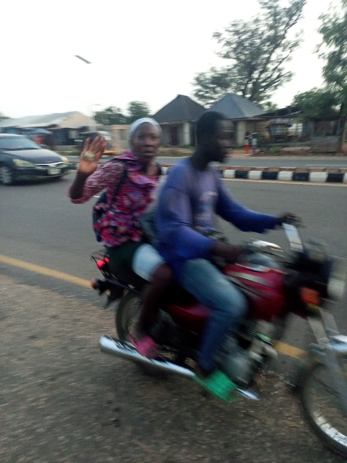 In Adankolo, Nigeria, a red motorcycle with a driver and a passenger is depicted in motion on a paved road
