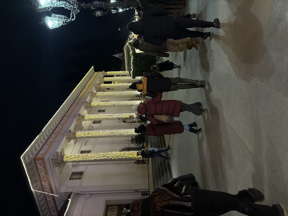 A nighttime scene presents a building adorned with illuminated columns, attracting a small crowd. People stroll along the sidewalk in front of the structure, some facing the camera, and others walking toward the building. A decorative lamppost with illuminated globes stands on the left. The scene is well-lit, and the individuals appear to be enjoying a leisurely evening in a festive atmosphere.