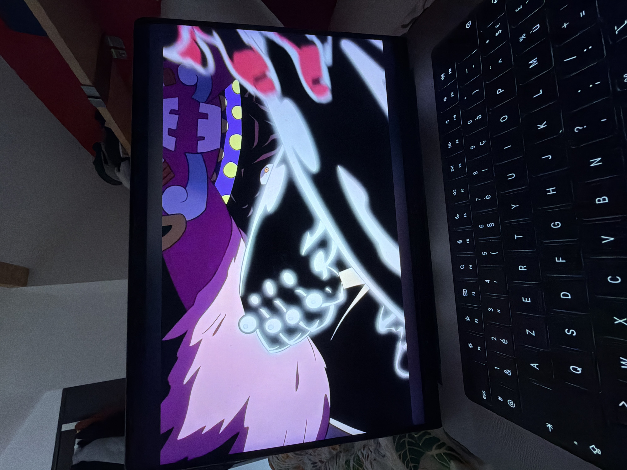 A laptop displaying an animated scene is positioned in a domestic environment. The screen displays a character with purple and white features, alongside bright white animated effects. Next to the screen is the laptop's keyboard, which is backlit. The background reveals partial views of a room with shelving and objects. The image was taken at an interior location; city is not possible to determine from the image. The image does not allow identification of La Salle-les-Alpes.