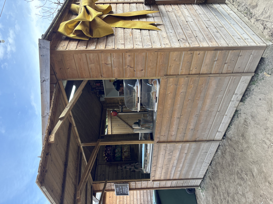 An outdoor wooden kiosk, constructed from light-colored horizontal planks, is depicted under a blue sky with scattered white clouds in Castellar del Vallès, Spain. The kiosk features a pitched roof and an open service counter. A large, golden, glittered bow adorns the upper right exterior wall. The ground in the foreground is unpaved dirt. Inside the kiosk, a person with dark hair, visible from the mid-chest up, stands behind the counter. The counter displays include a black chalkboard sign with white lettering on the left, a long clear food display case, a glass jar containing dark items, and two tiered clear domed display cases holding pastries. Behind the counter, a white shelf unit holds multiple dark bottles, and bags of snacks are visible hanging on a wall to the left. A fluorescent light fixture is mounted internally below the roof. To the far left, a dark green wheeled trash bin and a section of another wooden structure are visible. Bare tree branches are present in the upper right background.