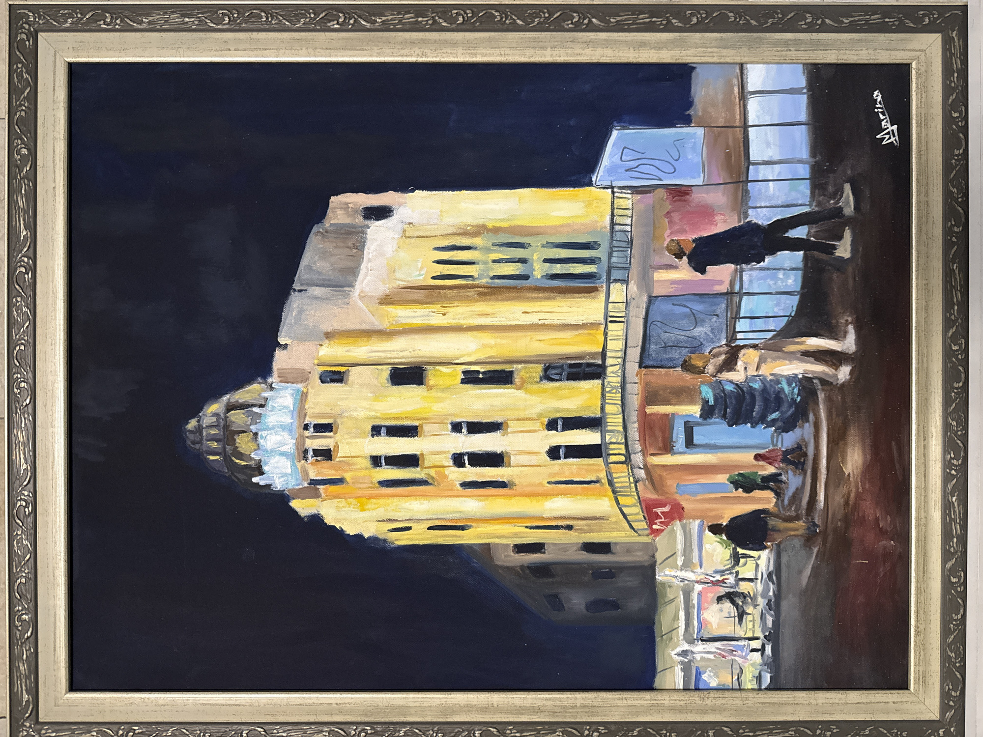 The image is a framed painting depicting a building in Plovdiv, Bulgaria. The building is tall and yellow with a dome. It has multiple windows, some reflecting light. There are people walking on the pavement in front of the building. The painting uses dark blues and browns to depict the night-time environment. The painting is signed in the upper-right corner.