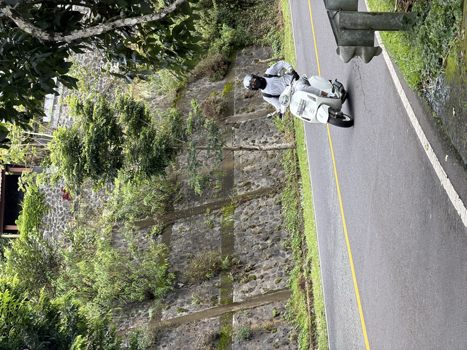 A person rides a white scooter on a gray asphalt road with a yellow center line. The rider wears a helmet and light-colored clothing. A retaining wall made of stones and concrete supports a slope with green vegetation. A metal guardrail is on the road's edge. Trees overhang the wall and the road.
