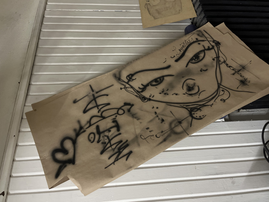 The image displays an indoor scene in Bahía Blanca, Argentina. A large, rectangular piece of brown kraft paper, adorned with graffiti art, leans against a white wall with vertical paneling. The artwork features a black spray-painted heart symbol in the upper left, followed by the stylized word "NAIBA" (or "NaiBA") in black spray paint, with a heart dotting the 'i'. Below this text, a stylized female face is rendered with black spray paint lines and shading, showing prominent eyes and a nose. Further abstract marks, splatters, and a cursive "Loyalties" tag near the right eye are also present on the paper. In the lower right quadrant, a dark, ribbed object, likely a radiator, is partially visible, with a smaller, light brown piece of paper or cardboard resting against it. A blue cylindrical object and a black cable are also visible at the bottom edge of the frame. No individuals are depicted.