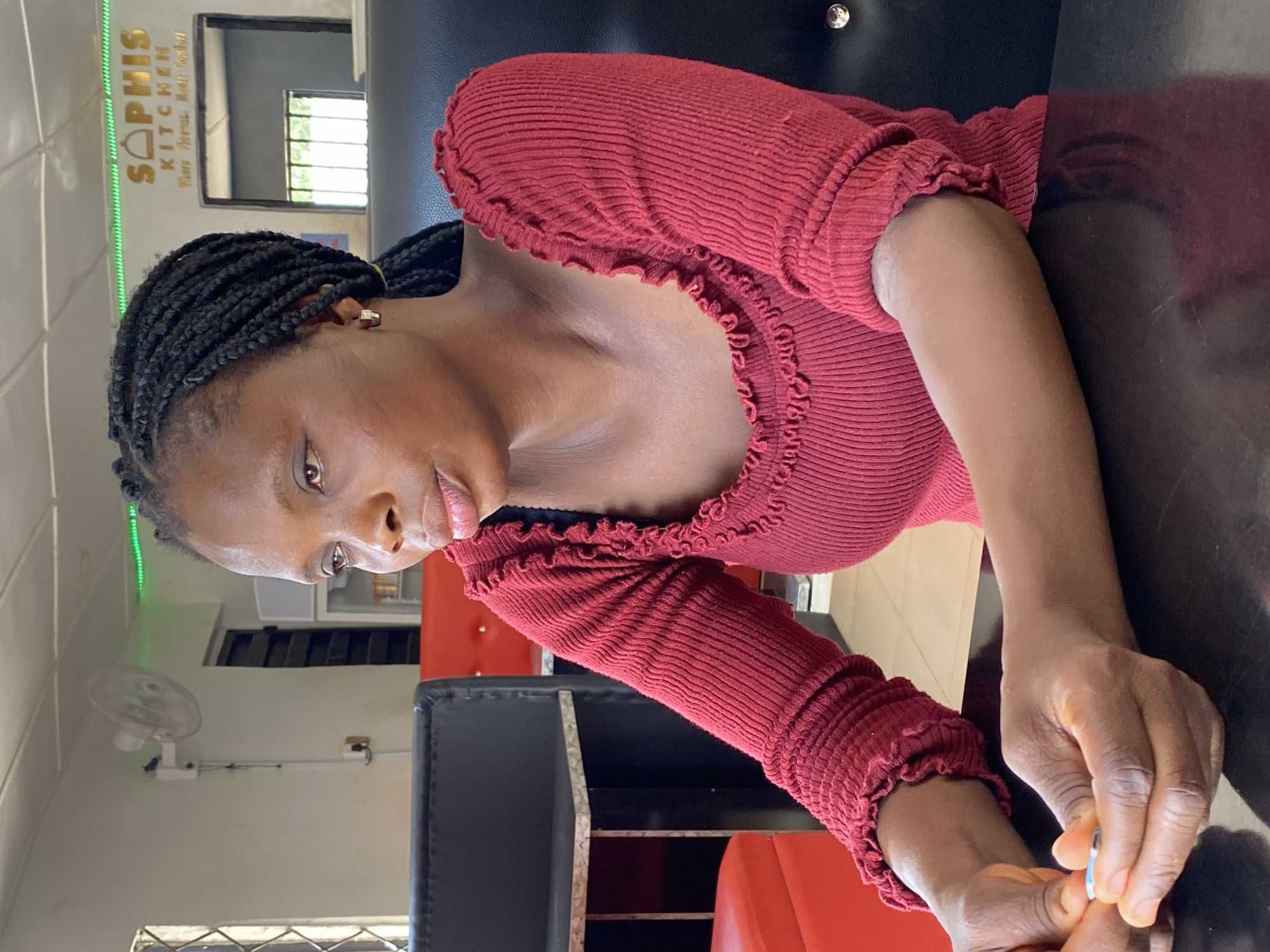 An adult Black female with black braided hair is seated at a dark table within SOPHIS KITCHEN, a restaurant located in Adankolo, Nigeria