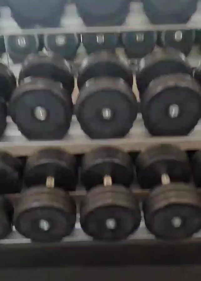 The video starts with a static shot of a gym's dumbbell rack, filled with various sizes of black dumbbells