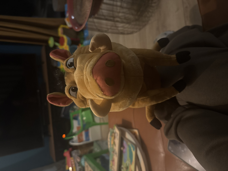 A plush Pumbaa, from The Lion King, sits prominently in the image's center. The toy's tan fur and pink nose are clearly visible. A person's gray sleeve is visible to the side. In the blurred background, there is children's furniture, including a toy truck and fan. Also in the background are books and a partially visible TV. The image has been rotated.