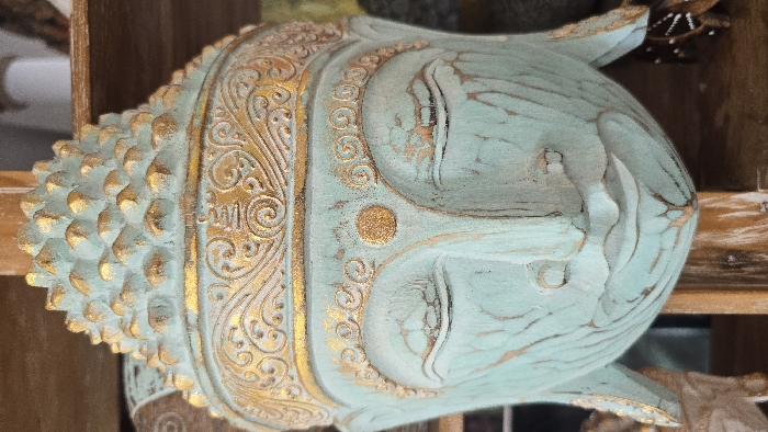 A turquoise and gold Buddha head rests on its side
