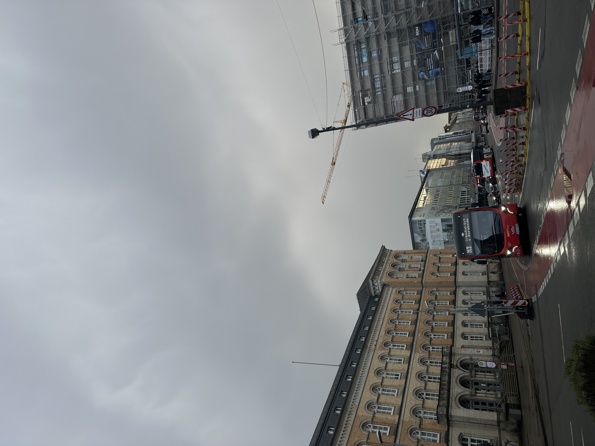 The image depicts a street scene in Osnabrück, Germany. A red double-decker bus with route number M3 is turning at an intersection. The architecture on the street includes an older building with arched windows and a newer building under construction with scaffolding. A construction crane is visible against a cloudy sky. Road markings, including red and white pedestrian crossings and traffic signs with a speed limit of 30 km/h, are present. There are people standing near the construction site. The street surface appears wet, suggesting recent rain. The bus has the destination of Schinkel-Ost / Bornheide.