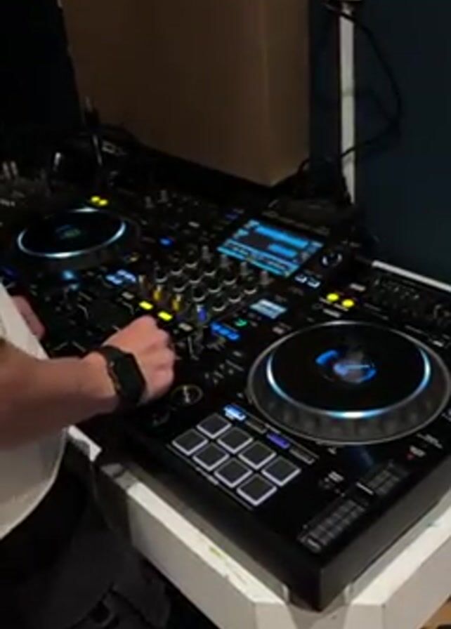 A person wearing a white shirt and a black wristwatch is adjusting the knobs on a black DJ turntable, which has lit up blue and green buttons and a small screen. The turntable is on a white desk. There is a black speaker and other electronic equipment behind the turntable.