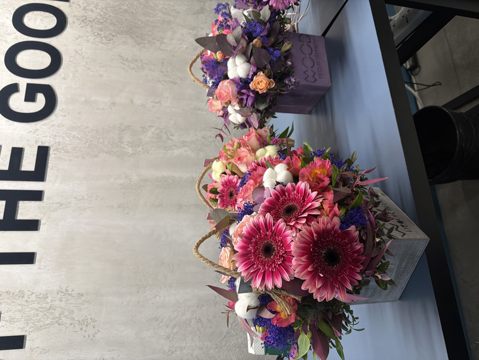 The scene depicts three elaborate floral arrangements on a dark blue table surface within a commercial establishment in Yerevan, Armenia. The background features a light grey, textured wall with large, dark, sans-serif letters spelling "THE GOO," likely part of a phrase like "THE GOOD." The prominent arrangement on the left is housed in a rectangular, light grey distressed wooden box with two rope handles. This arrangement contains multiple vibrant pink gerbera daisies, smaller pink roses, clusters of small purple flowers, white cotton bolls, and various dark green and maroon foliage. The side of this container has "DECOR BRANDS" text partially visible. To the immediate right and slightly behind, a second, similarly styled arrangement is visible, also in a light wooden container with rope handles, showcasing pink flowers, purple accents, and cotton bolls. Further to the right, a third, slightly smaller arrangement is presented in a solid purple wooden box, also with two rope handles. This arrangement includes peach and pink roses, clusters of small purple and orange flowers, white cotton bolls, and dark green/purple foliage. The text "WOOD DECOR BRANDS" is embossed on its side. The table extends to the right, and beneath it, a black waste bin and a power cord are partially visible against a light grey floor. No people are present in the image.