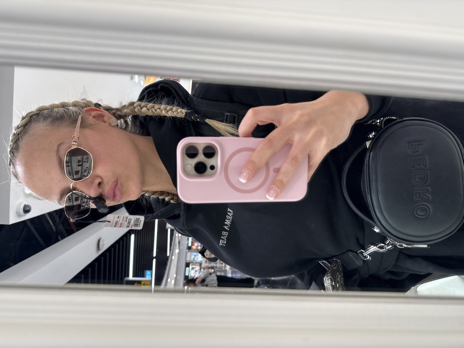 A fair-skinned female individual is depicted in a mirror selfie, captured from the upper torso. She is posing with her head slightly tilted and lips pursed, trying on a pair of polygonal, rose gold-rimmed sunglasses with dark lenses. A price tag, partially visible as "£39.00", hangs from the sunglasses over her nose. Her blonde hair is styled in two distinct braids on either side of her head. She wears a black hooded sweatshirt with "KARMA BABY" (reflected as "YBAB AMRAK") embroidered in white text on the chest. In her left hand, she holds a light pink iPhone, equipped with a MagSafe ring on its back; her fingernails are manicured with white French tips. A black, oval-shaped cross-body bag, embossed with "PEDRO" (reflected as "ORDEP"), is visible across her lower torso. The background, seen in reflection, indicates a brightly lit indoor retail environment, featuring overhead lighting, display shelves with merchandise, and a ceiling-mounted security camera. Another blurred figure is visible in the distant reflection. This scene takes place in Crawley, United Kingdom.