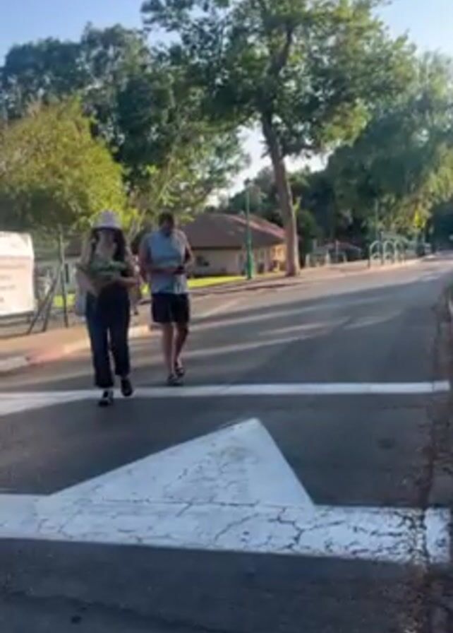 two people walking across a crosswalk on a paved street, in what appears to be a park or recreational area. The woman is wearing a sun hat, jeans, and a dark top, and she is carrying a bundle of green foliage. The man is wearing a tank top, shorts, and sandals, and he is looking at his phone. The crosswalk is marked with a large white arrow. There are trees and greenery on both sides of the street, and in the background, there are some buildings and what looks like a bicycle rack. There are a few other people visible in the background. The weather appears to be sunny and clear.