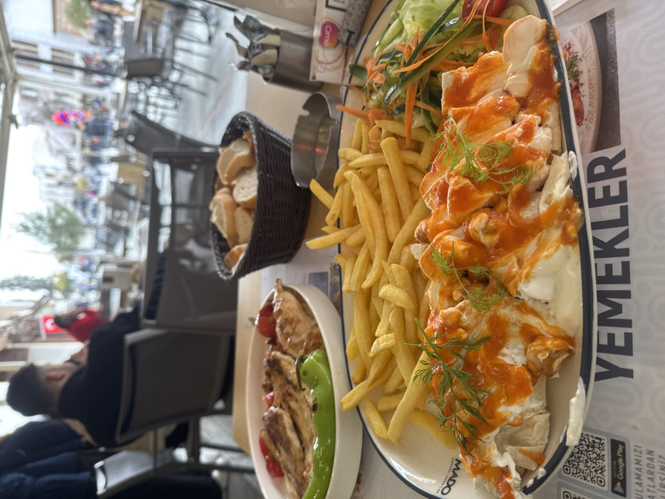 The scene is set inside a MADO restaurant or cafe in Edirne Merkez, Turkey, specifically at a table with a view towards an outdoor street