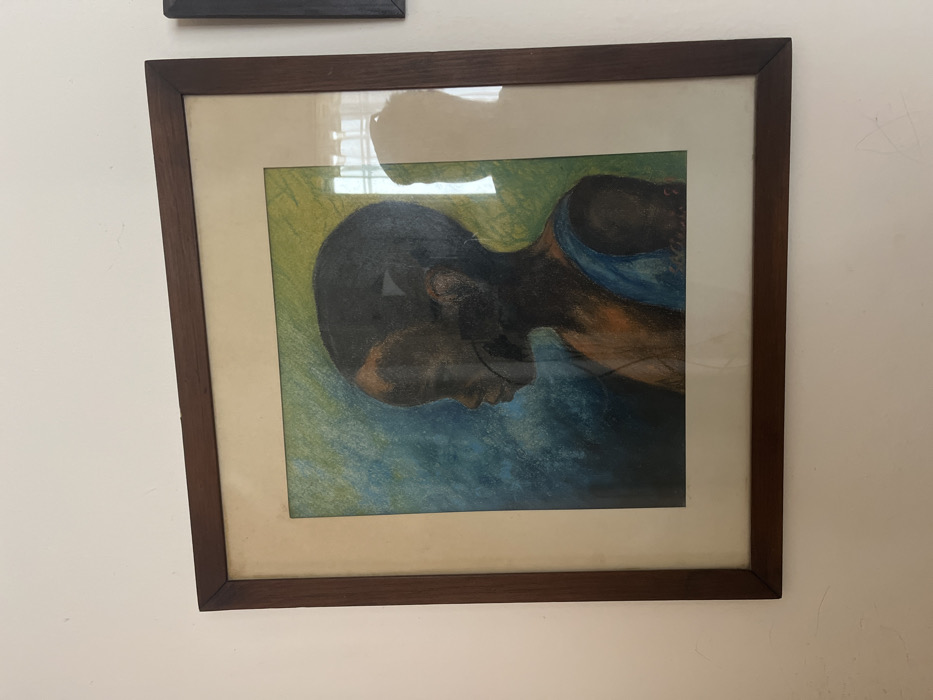 An indoor scene in Bernal Este, Argentina, presents a framed artwork mounted on a light-colored, possibly off-white, wall. The rectangular artwork is enclosed in a dark brown wooden frame, with a light beige or off-white matboard separating the frame from the central image. The artwork itself depicts a side profile portrait of a young person with dark skin, facing towards the left. The background of the painting transitions from blue on the left to green on the right. The subject appears to be wearing a blue garment over their visible right shoulder. The artwork is covered by a reflective glass panel, displaying reflections that obscure parts of the image, including the partial shadow of an individual on the right side. A portion of another, darker framed object is visible on the wall immediately to the right of the primary artwork.