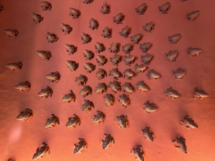 A salmon-colored wall hosts a dense formation of brown, spotted frog figurines