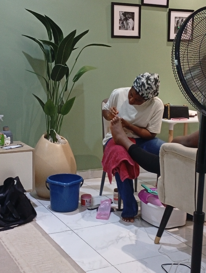 An indoor scene depicts a beauty salon or spa located in Abuja, Nigeria, during a pedicure service