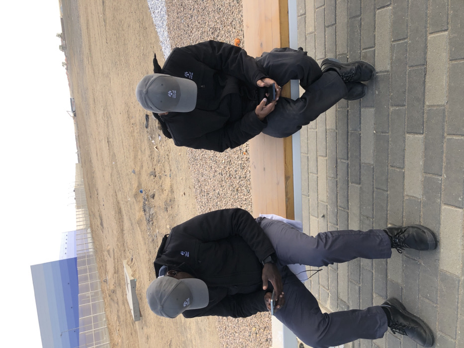 Two men are seated side-by-side on a wooden bench with a light metal frame, positioned on a paved area composed of rectangular grey pavers. Both individuals wear dark-colored padded jackets, dark trousers, and dark lace-up shoes. Each man has a grey baseball cap with a circular logo featuring a triangular/gear-like emblem and text (partially visible, resembling "Saud HVAC" or similar) on the front, and the same logo is present on the left chest of their jackets. Both men are looking downwards, engrossed in their respective smartphones held in their hands. The man on the left has a dark-colored watch on his left wrist and a white earbud wire is visible near his lap. Behind the bench, the ground transitions to a coarse gravel area, followed by extensive, undulating sandy terrain indicative of a desert environment. In the background, a large building or structure with horizontal blue and light blue panels is visible. A chain-link fence runs in front of this structure. Scattered concrete elements are present on the sandy ground, and further in the distance, what appears to be construction equipment can be faintly discerned. The sky is a light, clear color, suggesting daylight in Hanak, Saudi Arabia.