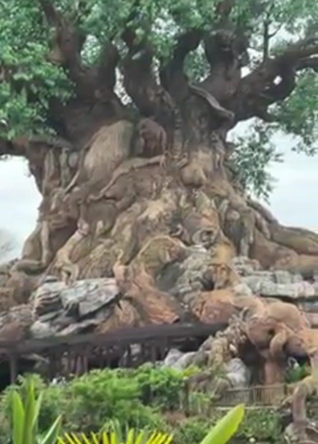 large, detailed artificial tree with carvings of animals on its trunk and branches. The tree is surrounded by lush vegetation, including ferns and leafy plants. Water appears to flow from the upper levels of the tree, creating small waterfalls. A wooden structure with railings is visible beneath the tree's base. The sky is overcast. Voices are heard in the background.