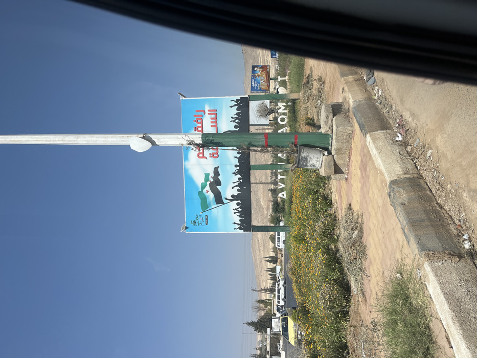 The image displays an outdoor street scene in Mu'adammiyat ash-Sham, Syria, under a clear blue sky