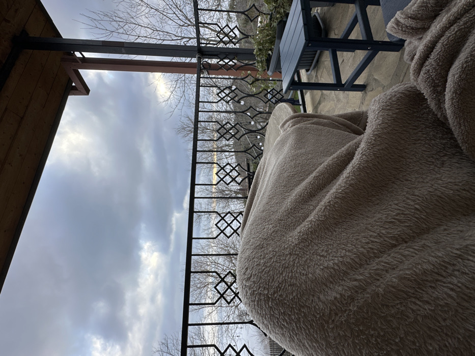 The image displays an outdoor balcony or patio in Sighnaghi, Georgia, under an overcast sky with a faint horizon glow. An individual is seated in a chair in the foreground, largely covered by a beige, textured fleece blanket. A small, dark blue slatted side table and a dark potted plant with green foliage are present on the stone-paved floor to the right. A black metal railing with repeating geometric patterns spans the midground, with string lights visible behind it. Beyond the railing, numerous bare trees indicate a cold season. A wooden ceiling structure with visible planks and a dark brown support column is present overhead on the right.