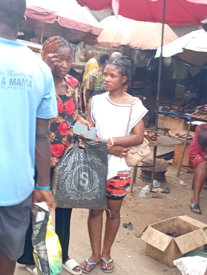 A woman in a white shirt and patterned shorts stands next to another woman in a floral shirt and black pants, holding a "SUPER SHIPPING" bag and a cell phone. They're on a dirt ground, possibly a market, where merchandise is for sale. A person in a blue shirt stands to the left. Overhead are umbrella-like awnings providing shade. A cardboard box sits nearby on the ground.