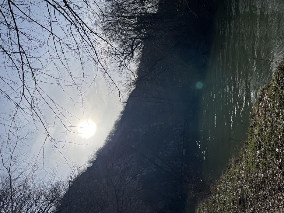 The image depicts a natural outdoor scene in Petrevene, Bulgaria, under bright daylight conditions, likely during late winter or early spring. A dark-green river flows from the right foreground towards the mid-left background, reflecting sunlight in shimmering patches. The immediate left bank consists of sparsely vegetated soil with patches of dried leaves and some green grass. To the left, a steep, rocky hillside, heavily forested with bare deciduous trees, rises dramatically, casting significant shadows. At the base of this hillside, partially obscured by shadow, a narrow, dark-colored bridge or walkway spans the river, with a light-colored sign visible on its structure. Across the river, on the right side, a dense line of bare trees forms the opposing bank. The sky, visible above the hillside and trees, is light blue with thin cloud cover. A bright, glaring sun is positioned in the upper left quadrant of the sky, and a faint white aircraft contrail is visible in the upper right. No human subjects, animals, or explicit actions are present.