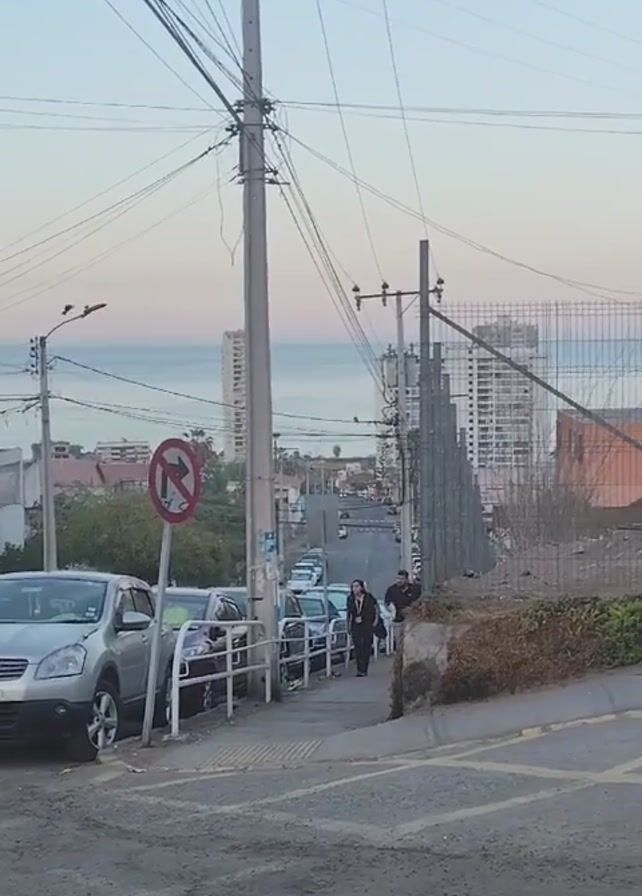 The camera looks down a paved street sloping away from the viewer. The sea is visible in the distance. Utility poles with many wires are on the left side of the road, and a chain link fence separates the road from an area overgrown with vegetation on the right side of the road. Several cars are parked along the left side of the street. A no right turn traffic sign is also on the left, in front of the first car. Two people, a woman in black clothing and a man wearing a black hat and shorts, are walking down the street toward the viewer. The sky is visible above the buildings and wires, and has light tones of pink and blue.