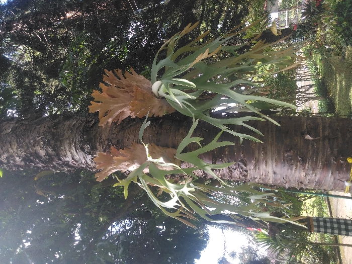 The image displays an outdoor scene in Cipanas, Indonesia, centered on a substantial tree trunk. The tree trunk is dark brown with distinctive horizontal ridges and a textured, slightly flaky surface. Attached to its upper-mid section are two prominent epiphytic staghorn ferns (Platycerium species). Each fern consists of light brown, rounded basal fronds adhering to the trunk, with multiple elongated, deeply lobed, light green foliage fronds extending downwards. Bright natural sunlight illuminates the scene, creating areas of shadow and highlights. In the background to the left, a black-and-white checkered fabric is wrapped around a slender pole or small tree, situated amidst other green vegetation. To the right, dense green foliage from additional trees forms a blurred background, with a distant structure faintly visible through the leaves. The ground beneath the trees appears to be covered in grass and shaded earth. No individuals, actions, or specific interactions beyond the growth of the ferns on the tree are visible.