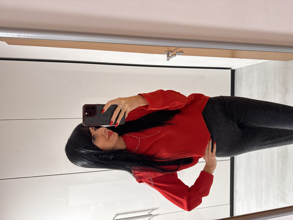 The scene is situated indoors, specifically in a room in Nuremberg, Germany. A female individual, appearing to be in her 30s, is depicted from the waist up, captured in a mirror selfie. She has long, straight dark hair with bangs, light skin, red lipstick, and a small silver stud piercing in her left nostril. Her attire consists of a long-sleeved, high-necked red top and dark, possibly black or charcoal, trousers with a subtle reflective texture. A slender, silver-toned Y-necklace is visible around her neck. Her right hand, with red nail polish and a ring on the ring finger, holds a dark-colored smartphone with a triple-lens camera array, positioned to capture her reflection. Her left hand is placed on her hip. The background features white, high-gloss wardrobe doors with linear silver handles to the left, and a light-colored wooden door with a silver-toned handle to the right, adjacent to a light pink wall section. The flooring is light-colored laminate or wood.