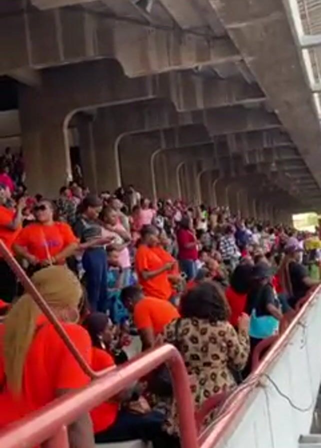 A view from a stadium shows a crowd of people seated in the stands. The majority of the crowd is wearing orange shirts. Some individuals are standing, while others are seated. Many are looking towards the stadium field, though their specific activities cannot be determined with certainty from this vantage point. The stadium seating is concrete with red guardrails. The structure above the crowd appears to be part of the stadium's architecture, consisting of layers of concrete support beams. The overall atmosphere seems to be that of a large public gathering.