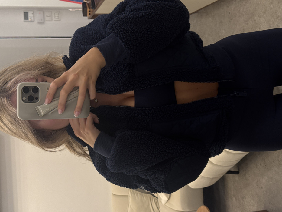 A woman wearing a navy blue teddy jacket and a matching sports bra and leggings is taking a selfie in a mirror