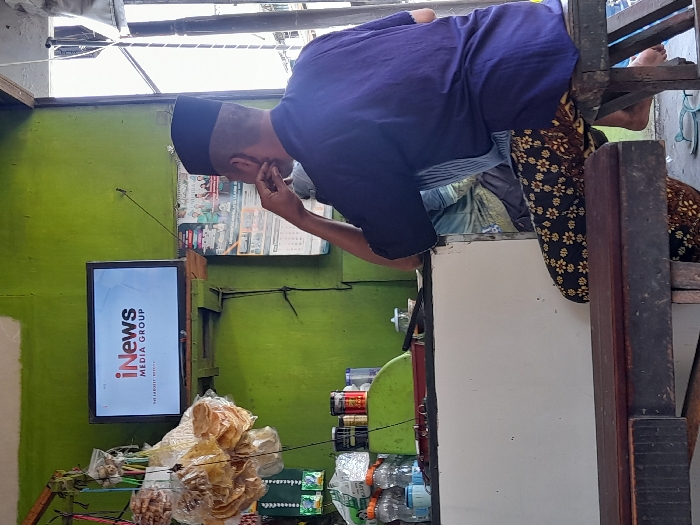 The image depicts an interior scene within a commercial establishment in Wedoro, Indonesia. A male individual, viewed from the rear, is seated on a simple wooden stool, observing a television screen mounted on a faded, uneven green wall. He wears a black peci, a dark blue long-sleeved shirt, and dark pants with a brown and gold floral/batik pattern. His right hand is positioned to his chin/jaw area. Light blue flip-flops rest on the floor near his bare feet. The television displays the "iNews MEDIA GROUP" logo in red and white. To the left of the screen, several clear plastic bags filled with light-colored, crispy snacks hang from a metal rod. Below the snacks, a white counter supports various small jars, bottles, and a green market-style weighing scale. A calendar featuring images and text is affixed to the wall below the television. A black wire extends diagonally from the upper right towards the TV, and another black cable runs vertically along the wall. A dark wooden bench-like structure occupies the immediate foreground. Bright natural light illuminates the scene from the right side, suggesting an open exterior.