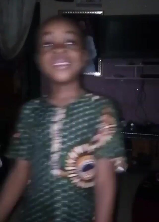 A young boy with short hair, wearing a patterned green shirt, stands in a dimly lit room. He is looking directly at the camera and smiling. He gestures with his hands, first making a heart shape and then moving his arms. Behind him, there is a television, a framed picture on the wall, and some decorations on a shelf. A curtain is visible to the left of the frame.