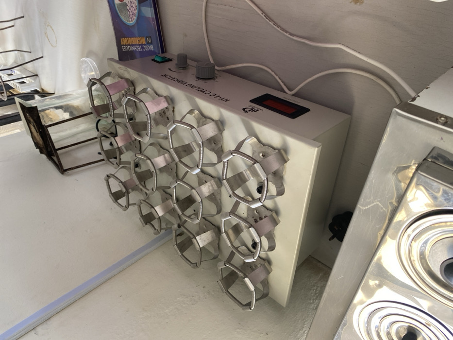 The image displays an indoor laboratory environment in Kuru Dungus, Nigeria. A white HY-4C CYCLING VIBRATOR, manufactured by Laborex and marked "MADE IN CHINA," occupies the central midground. This device features a prominent red rocker power switch, a green indicator light, and two grey rotary control knobs on its front panel. Positioned on its top surface are sixteen empty stainless steel test tube or flask racks, arranged in a uniform 4x4 grid. Each rack is a cage-like structure with a spring mechanism for securing vessels. A white electrical power cord extends from the right side of the vibrator. In the lower foreground, a partial view of a stainless steel apparatus, appearing to be a two-burner hot plate or water bath, is visible. It features two circular heating elements, each with a black central control knob. To the right of the cycling vibrator, a book with a blue cover, titled "BASIC TECHNIQUES IN MICROBIOLOGY," rests horizontally on a surface. In the background, a glass container encased within a metal frame and a clear, circular laboratory dish are present. The room's environment consists of light-colored walls, one exhibiting a thin vertical blue stripe on the left, and a light-colored floor. No individuals are present in the scene, and no active processes or interactions are depicted.