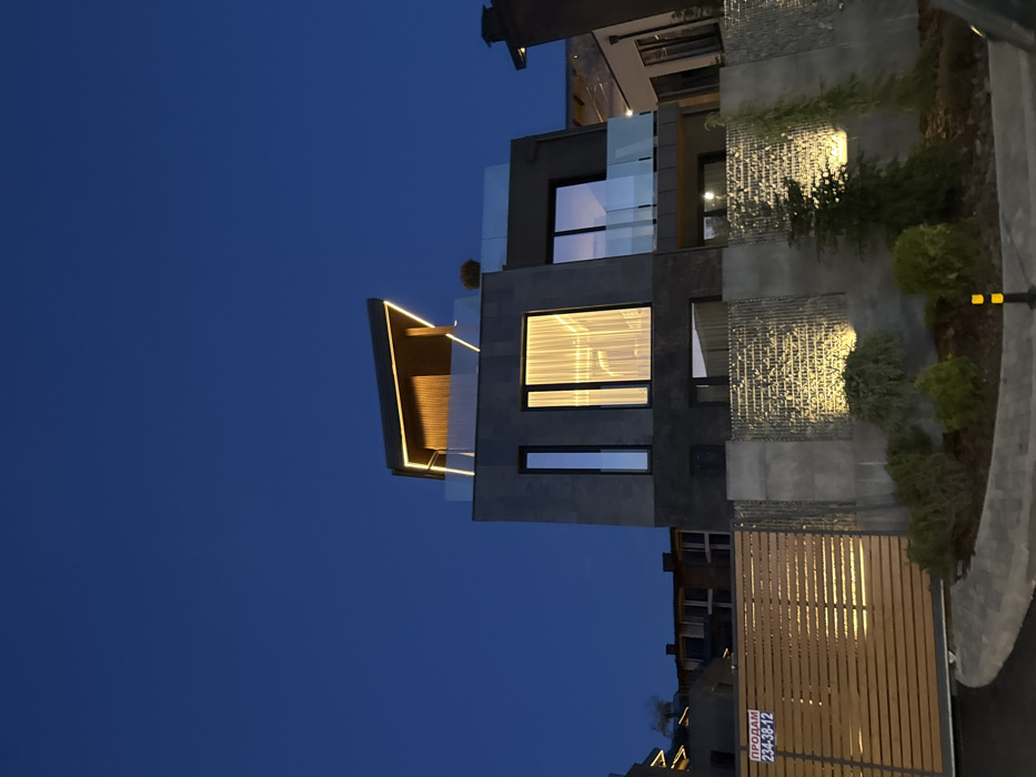 An evening photograph taken in Estosadok, Russia, depicts a modern, multi-story residential building with prominent architectural lighting. The building's exterior is dark, possibly constructed of stone or concrete, and features large windows; one on the second floor illuminates a room through sheer white curtains, emanating a warm yellow glow. Upper levels include glass-paneled railings for balconies or terraces. The angled roof line incorporates linear, warm-toned accent lighting along its edges. In the foreground, a perimeter fence encloses the property. To the left, a light-colored wooden slatted sliding gate displays a white sign with black text reading "ПРОДАМ 234-38-12" (Russian for "FOR SALE" followed by a phone number). To the right of the gate, the fence continues with sections of concrete wall integrated with vertical metal grid structures, illuminated by ground-level spotlights that highlight various green shrubs and small trees planted along the base. A curved asphalt or paved driveway section with a black and yellow reflective bollard is visible in the immediate foreground. The background shows partially visible structures of other buildings. The sky is a uniform, dark blue, indicating either deep dusk or night. No individuals or specific actions are depicted in the scene.