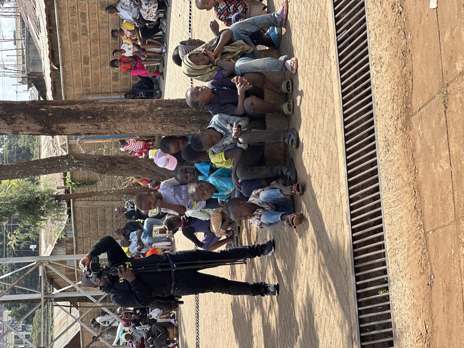 The scene depicts an outdoor gathering in an urban area consistent with Nairobi, Kenya. On the left, a Black male videographer, dressed in a black hoodie and pants, operates a professional video camera mounted on a tripod, directing it towards a group of approximately 15-20 children. These children, primarily young boys and a few girls, are seated on a low concrete ledge and directly on the reddish-brown ground in the midground, wearing various casual clothing including t-shirts, jeans, and sandals. Several children's gazes are directed towards the camera's position. In the immediate foreground, a metallic drainage grate is embedded in the paved ground. The background features a light brown concrete block wall, behind which a group of adults is seated on chairs, observing the scene. Distant corrugated metal roofs and buildings are visible on a hillside beyond the wall. Two tree trunks are prominent in the midground, casting sharp shadows on the ground under bright daylight.