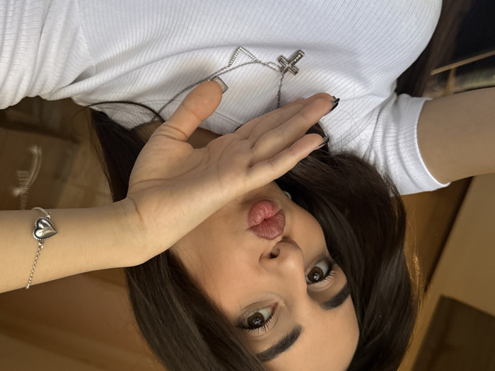 A forensic description of the scene depicts a young adult female, identified as being in Yerevan, Armenia. The subject has dark brown hair, brown eyes, and fair skin, visible from the mid-chest upwards. She is positioned for a selfie, directing her gaze towards the camera with her lips pursed in a "kissing" pose. Her left hand is raised, with fingers partially obscuring her chin area. She wears a white ribbed short-sleeved top. Adorning her neck is a silver-toned necklace featuring two pendants: a small cross embellished with what appear to be small stones, and a minimalist V-shaped pendant. On her right wrist, she wears a silver-toned bracelet with a heart-shaped charm. The fingernails on her visible left hand are painted a dark color. The background is out of focus, presenting blurred warm light and darker tones, indicative of an indoor setting. No specific architectural or environmental markers of Yerevan are discernible in the blurred background.
