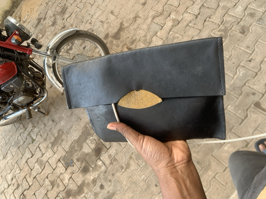 A black clutch with a reptile-patterned design is held in a person's hand. The bag has a fold-over closure. In the background, there is a motorcycle partially visible on the left and paved ground. A portion of another person's leg, covered in gray clothing, is visible to the lower right.