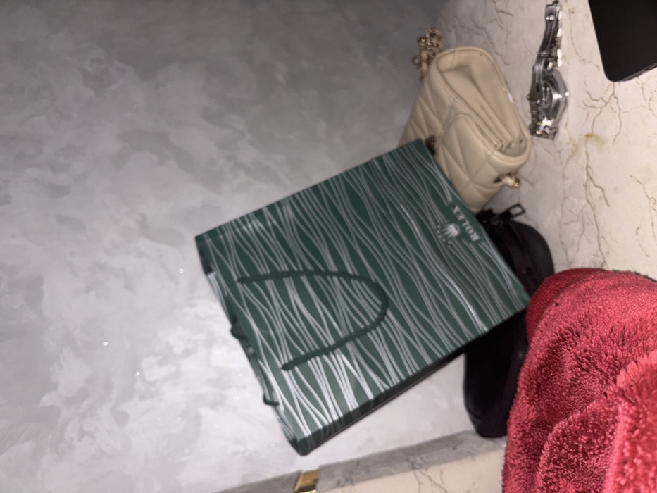 A cream-colored quilted purse sits next to a silver wristwatch. A green Rolex bag with white wavy lines is in front of a small black bag. A red towel is visible on the right side of the frame. The items are on a marble surface with a mottled gray wall in the background.