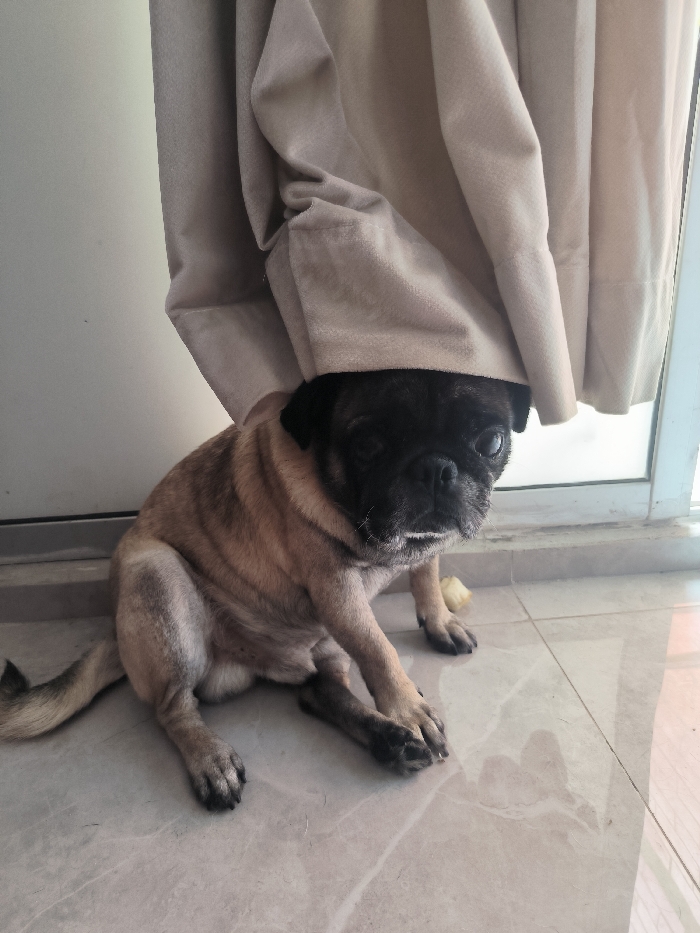 A pug sits on a light-colored tile floor, partially concealed under a beige curtain