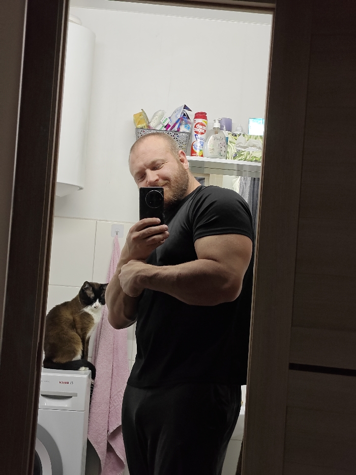 A muscular man in a black t-shirt and sweatpants takes a selfie in a bathroom mirror. He's smiling slightly, flexing his arm. Behind him, a brown and white cat sits perched on a white washing machine. A pink towel hangs nearby. Various bathroom supplies like soap and cleaning products are visible on a shelf above.