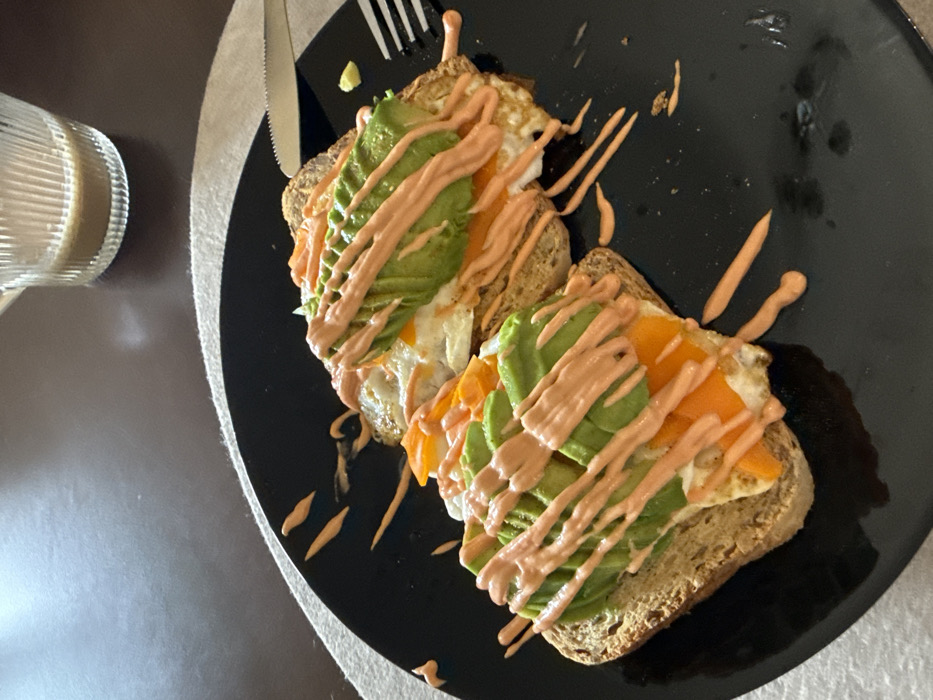- "This image captures an interior dining setting in Sofia, Bulgaria, featuring two pieces of avocado and egg toast on a black, glossy plate" by FM-j1Izo1, licensed under CC BY 4.0