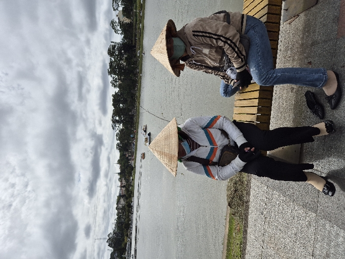 Two individuals in conical hats sit beside a body of water. The person in front wears a white jacket, black pants, and black shoes. The person behind them wears a tan jacket, blue jeans, and black shoes. They both wear face masks and gloves. Boats rest in the water which is bordered by trees and buildings. A cloudy sky is visible above.