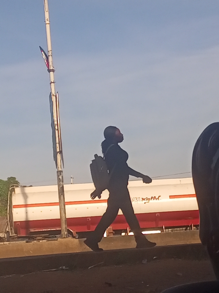 This image depicts an outdoor scene in Jos, Nigeria, characterized by strong backlighting under a clear, light blue sky. In the midground, a female individual is seen in silhouette, walking from left to right. She is wearing what appears to be a dark top and trousers, and a backpack is visible on her back. Her head is turned slightly to the left, and her arms are positioned consistent with a walking motion. To the left of the walking individual, a tall, slender pole, light in color, extends vertically from the bottom of the frame towards the top. Near its upper section, a small, two-toned red and white flag or marker is attached. The immediate foreground shows a dark, uneven ground surface, likely dirt or asphalt, with a low concrete barrier or curb running horizontally across. On the far right, a partial silhouette of another individual's head and shoulder is visible, suggesting the photograph was taken from behind or next to someone. In the background, a large vehicle, possibly a tanker truck or train car, is horizontally positioned. It is predominantly white with a prominent orange-red stripe along its lower half. The text "MES Nigeria" is discernible in white against the red stripe. Further back on the left, green foliage from trees is visible, with faint outlines of structures beyond. The scene suggests a daytime setting with ambient sunlight coming from behind the camera's perspective relative to the main subject.